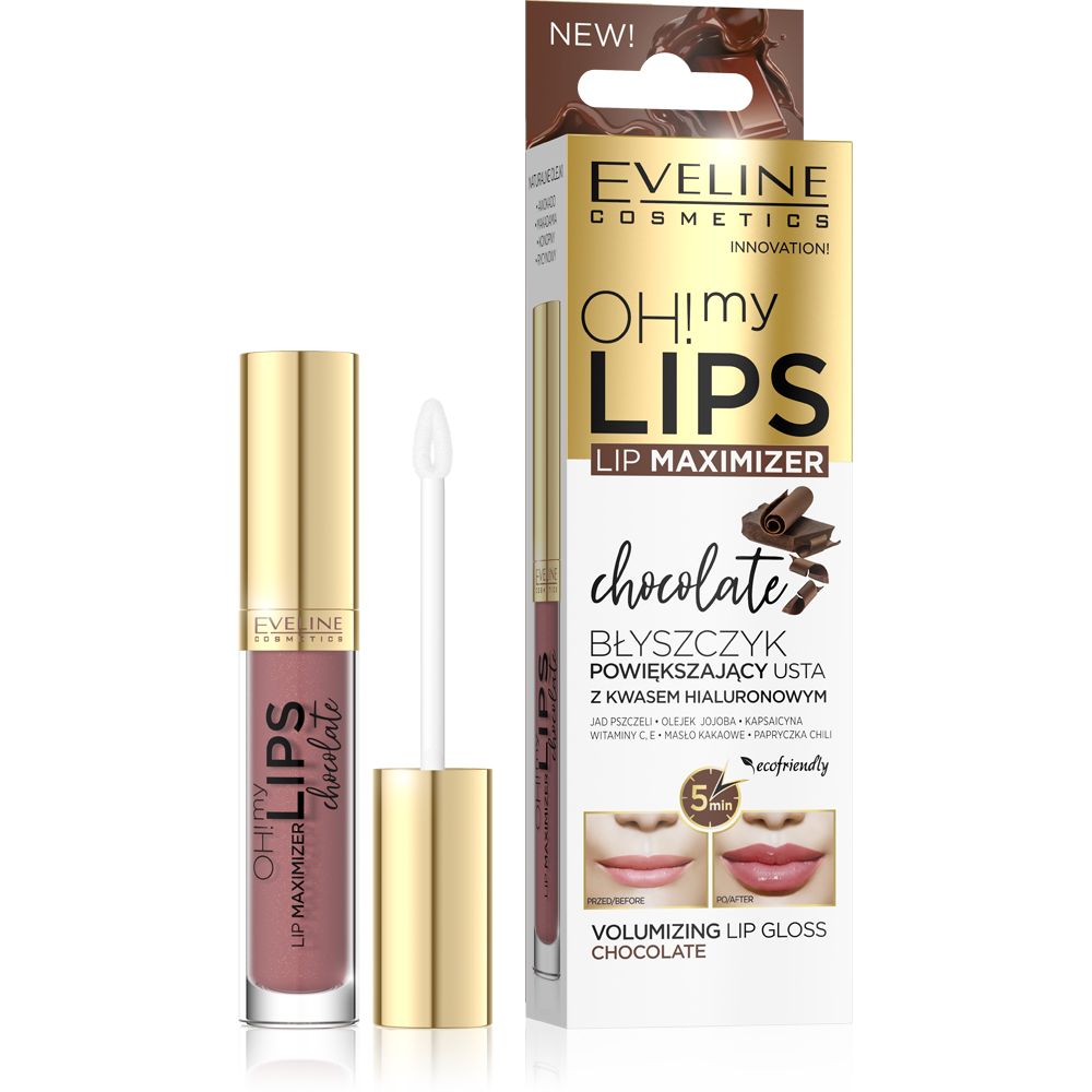 Eveline Lip Maximizer Chocolate’il on uuenduslik valem, mis põhineb mesilasmürgil ja tšillipipral, mis stimuleerivad pindmist vereinget, muutes huuled täidlasemaks. Huuleläige on rikastatud avokaado-, makadaamia-, kanepi- ja kastoorõliga, mis pehmendavad, niisutavad ja toidavad huuli. Koostises sisalduv hüaluroonhape, ingveriekstrakt ja vitamiinid aitavad rõhutada huulte loomulikku värvi. Huuleläikel on meeldiv šokolaadilõhn, mis püsib kaua pärast pealekandmist. Pane tähele, et kerge jahedus- ja kipitustunne annavad märku aktiivsete koostisosade mõjust.