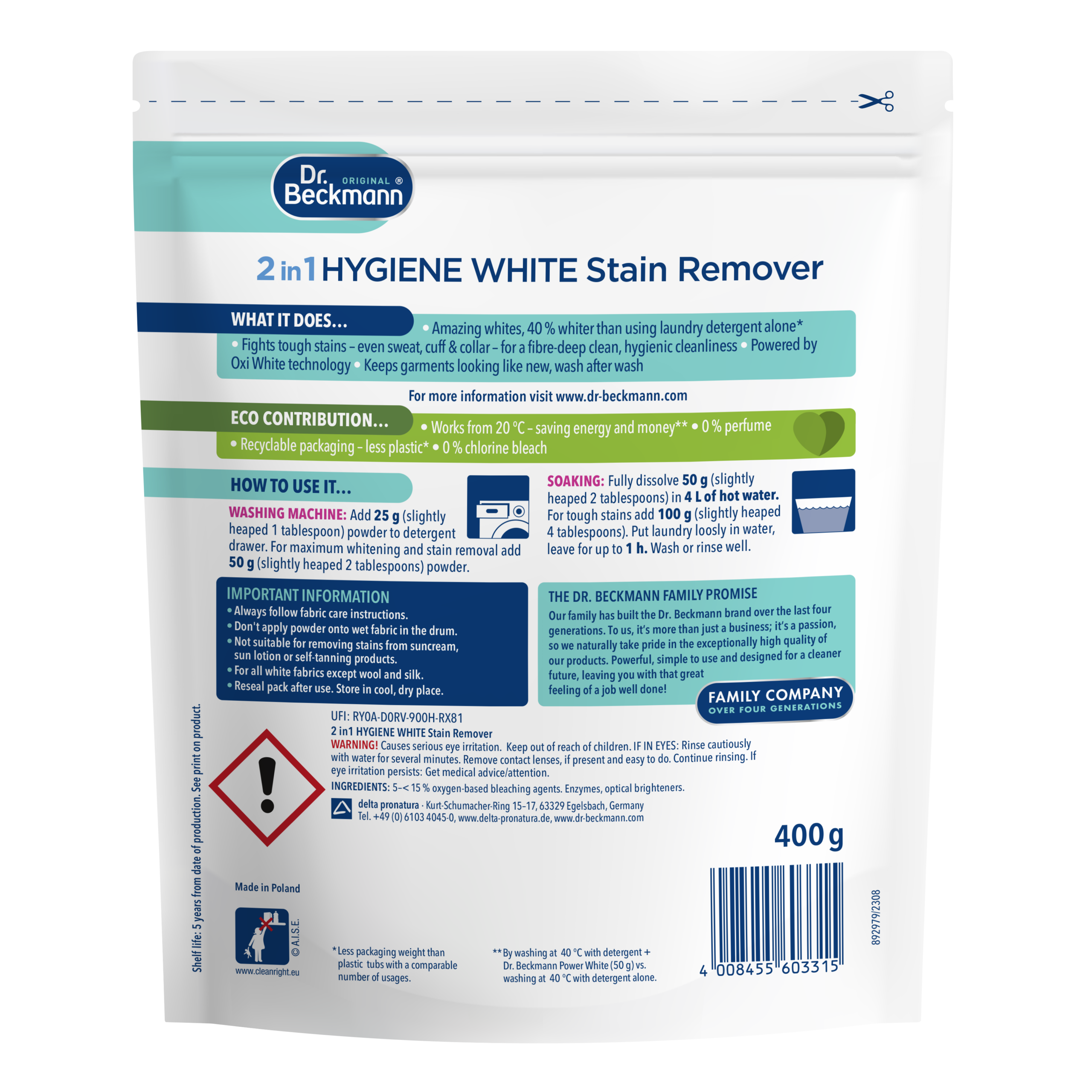 Dr. Beckmann 2in1 Hygiene White plekieemalduspulber on suure jõudlusega pulberlisand, mis suurendab regulaarsel kasutamisel pesuvahendi tõhusust ja aitab hoida kangaste uueväärset ning kirgast välimust. Pakendis mõõtelusikas mugavamaks doseerimiseks.