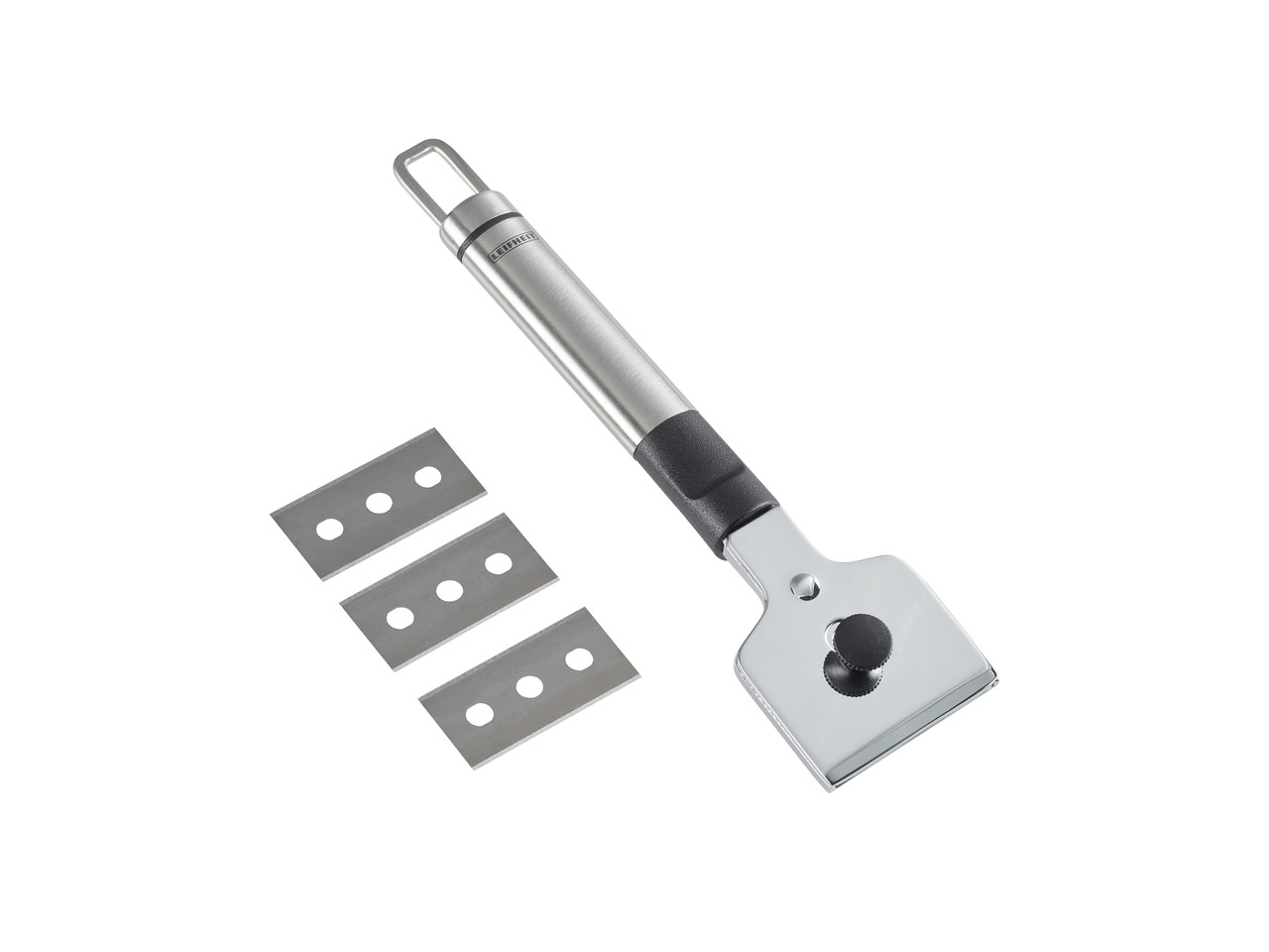 Leifheiti pliidiplaadi kaabits on kõrge funktsionaalsuse ja suurepärase disainiga. Eemaldab lihtsalt kõrbenud toidu pliidi plaadilt. Terakaitse on väga praktiline: see hoiab ära teiste esemete kriimustamise, kui kaabitsat sahtlis hoida. Samuti muudab see ohutuks hoiustamise ilma vigastuste ohuta ja kaitseb lõiketeri. Pliidiplaadi kaabitsa puhastamine on samuti väga lihtne. Pühkige lihtsalt niiske lapiga ja see on uuesti kasutamiseks valmis. Varuterad saab hoida Leifheiti pliidiplaadi kaabitsa peas. Kaasas kolm tera.