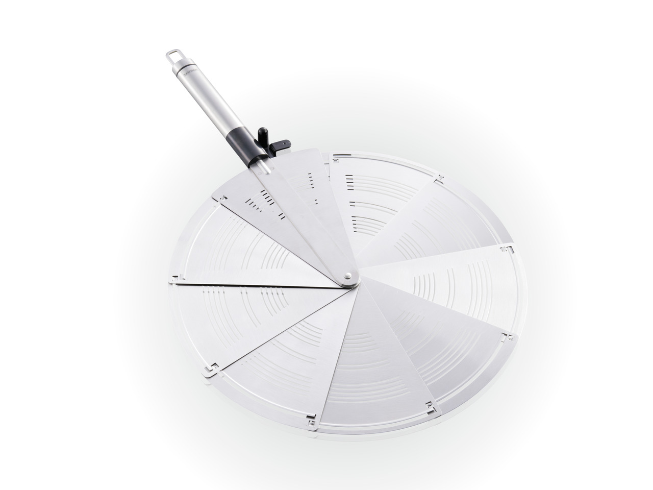 Kokkuvolditav rasvapritsmete püüdja väikeste auruavadega. Pannil oleva toidu küpsuse kontrollimiseks lihtsalt kokku volditav.
