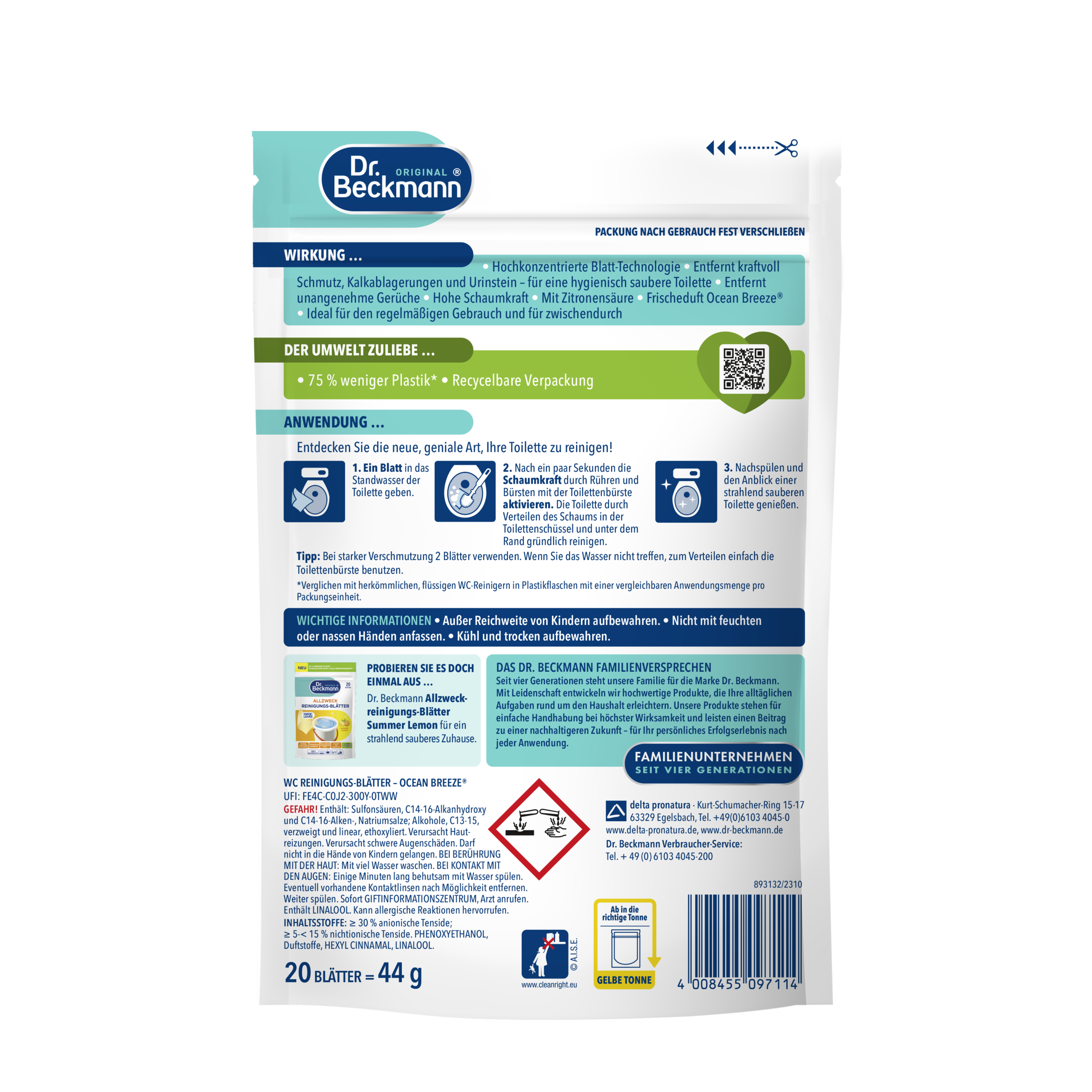 Dr. Beckmann tualetipuhastusvahendi lehed muudavad tualeti puhastamise mugavaks: ülikerged lehed on 100% veeslahustuvad ning toimivad võimsalt mustuse, katlakivi ja uriiniplekkide vastu.