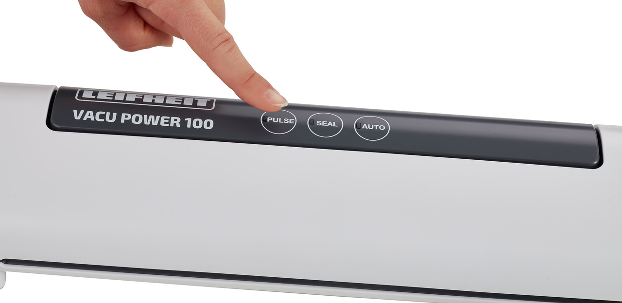 Täisautomaatne elektriline vaakumpakendaja Leifheit Vacu Power 100 sobib marjade, puuviljade, liha, kala, juurviljade ja paljude muude toiduainete pakendamiseks ja paremaks säilitamiseks. Efektiivse vaakumpumba jõudlus kuni 4 liitrit minutis. Vaakumpakendamine tagab toiduainetele pikema säilivusaja ilma säilitusaineid kasutamata. Seadmel on sensoriga puutetundlikud nupud, mis muudavad selle kasutamise lihtsaks. “Pulse” funktsioon võimaldab seadmel reguleerida vaakumi tugevust, seetõttu on see sobilik ka õrnema tekstuuriga toiduainete vaakumpakendamiseks. Vacu Power 100 vaakumpakendamise seadmega on võimalik tekitada vaakumkeskkonda ka toidukarpidesse, lisaseadmeid on võimalik soetada kaubandusest. Turvaliseks ja ohutuks kasutamiseks on seadmel elektrooniline temperatuurikontrolli funktsioon, mis takistab pakendite plastikute sulamist või kõrvetamist. Vaakumpakendaja on kompaktne ning seetõttu lihtne hoiustada. Komplekti kuulub vaakumpakendamise seade ja 10 plastikkotti suuruses 20x30cm. Seadmele sobivad kõikide kaubamärkide vaakumkotid laiusega kuni 30cm.